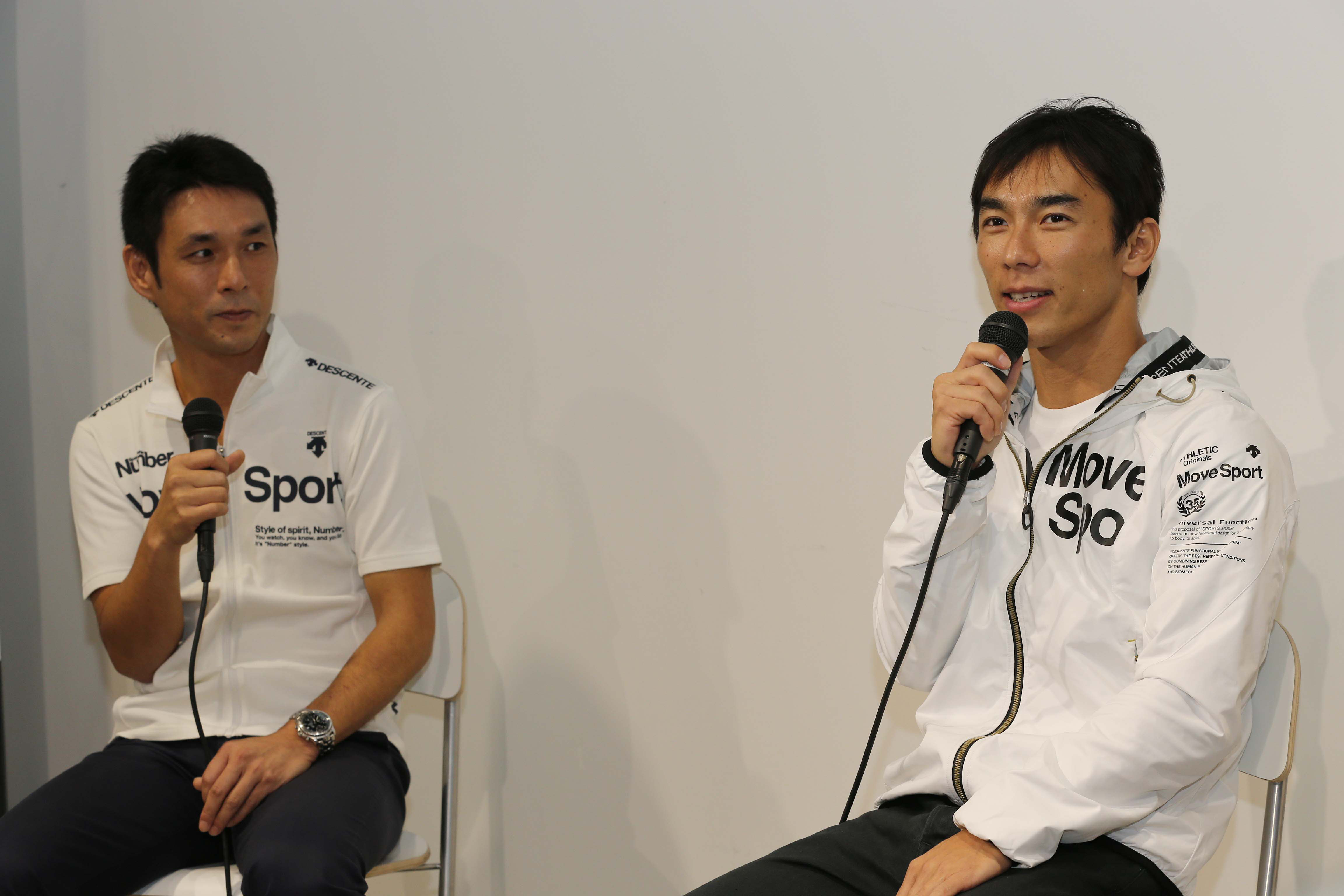 今回はデサント・グローバルマーケティング部の杉浦剛氏さん(左)とのトーク。契約開始当初の話やウエアなど製品開発秘話も