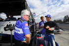 マシンを降りてエンジニアのエディと共にモニターを見てライバルの様子をうかがう