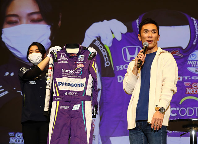 質問コーナーが終わったところで私は降壇。続いてステージ上で繰り広げられたのは、こちらも恒例となったプレゼントコーナーです。今回も琢磨クンが着用済みのドライバーズシャツ(2名)を筆頭に、レーシングシューズ(1名)、レーシンググローブ(1名)、キャップ類(7名)、さらにはヘルメットバイザー(2名)をプレゼントするという大盤振る舞い。ところが、今回は20周年記念ということで、「200戦記念ヘルメットバイザー(1名)」にくわえ、な、なんとTCM史上初のレーシングスーツ(1名)までプレゼントしてしまったのには驚きました。ちなみに、最後の特別賞品ふたつは抽選ではなく、琢磨クンとのジャンケンで決めたというのも、これまたTCMならではですよね。