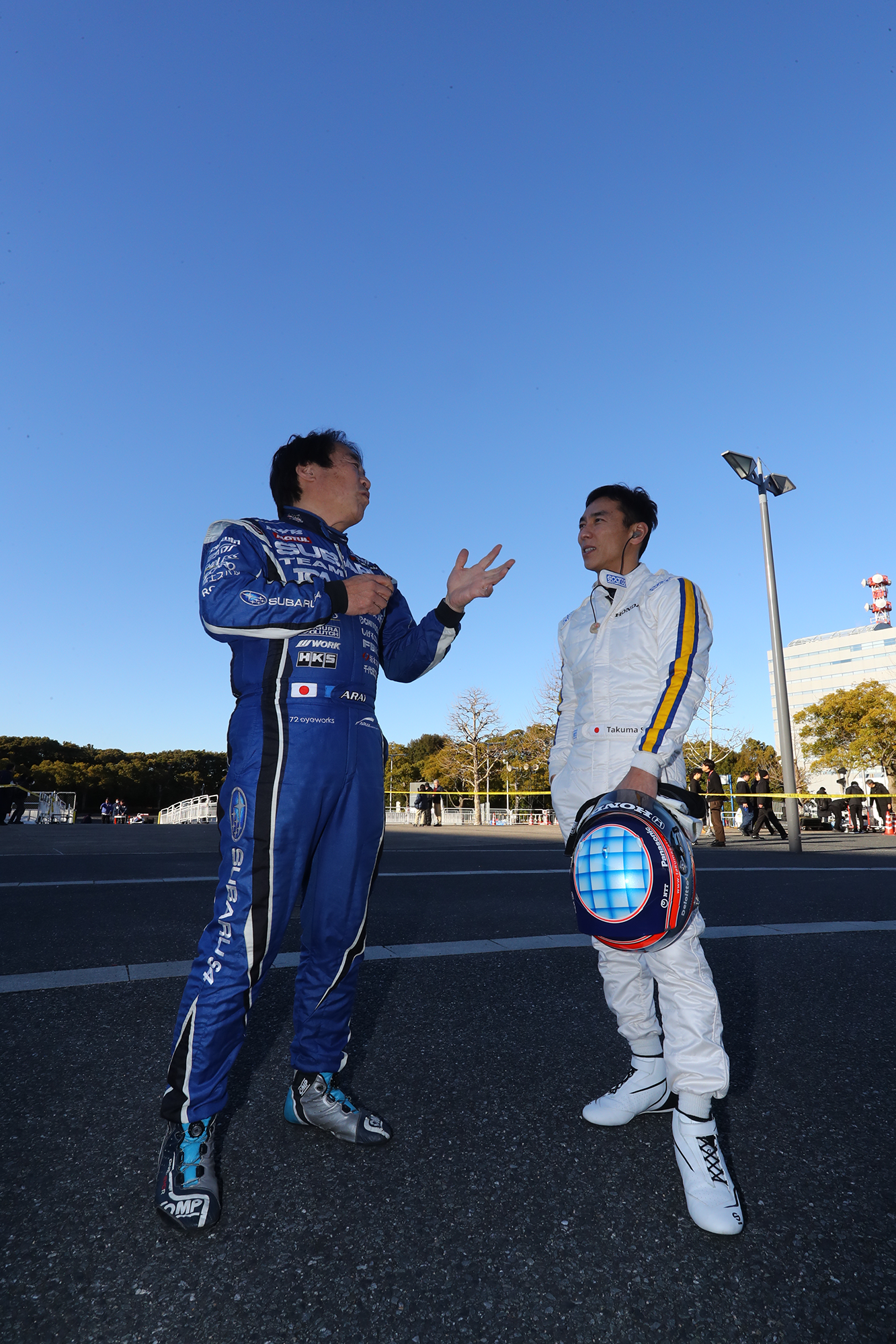 マシンのスタンバイを待つ間にラリーの新井敏弘さんにラリーの走り方を教わる